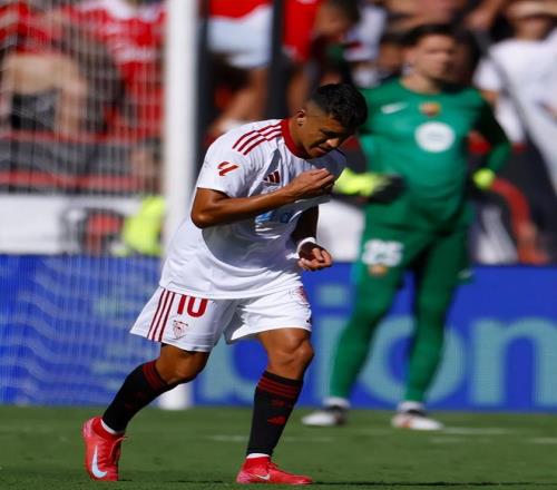 第35分鐘,塞維利亞再次輕易打穿巴薩的防線,伊薩克·羅梅羅上演浪費(fèi)機(jī)會(huì)帽子戲法,桑切斯一臉沮喪。