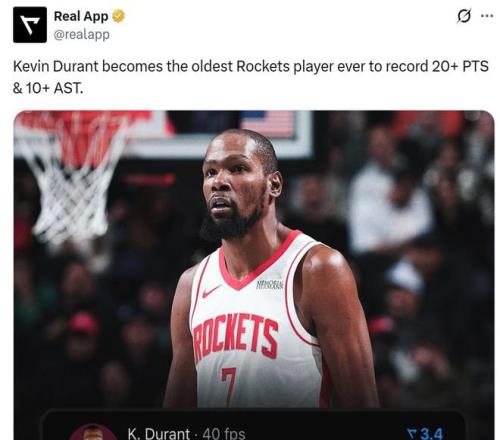 憑借這樣的表現(xiàn),37歲95天的杜蘭特超越德雷克斯勒成為火箭隊(duì)史單場至少拿下20分10助最年長的球員。