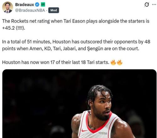 在伊森進(jìn)入首發(fā)的18場比賽中,火箭隊(duì)拿下17勝1負(fù)傲人戰(zhàn)績,當(dāng)他與杜蘭特、阿門、賈巴里、申京一起出戰(zhàn)時(shí),火箭隊(duì)凈效率達(dá)到夸張的+45.2,一共51分鐘時(shí)間里面贏了對(duì)手48分。