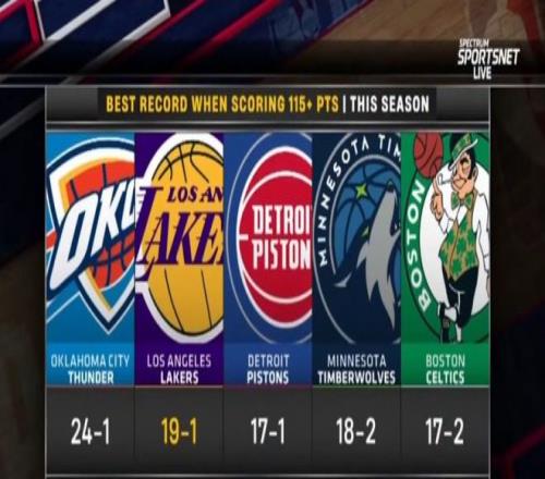 首先,本賽季賽季以來,湖人得分115+球隊?wèi)?zhàn)績?yōu)?9勝1負(fù),全聯(lián)盟僅次于雷霆。